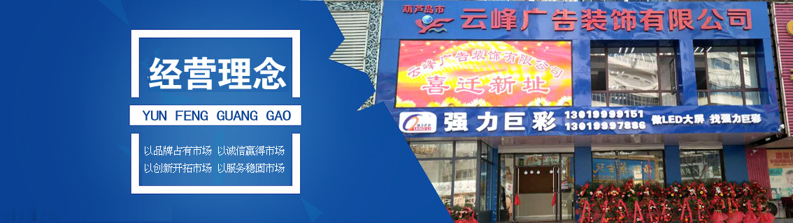 葫蘆島市云峰廣告裝飾有限公司自創(chuàng)立以來(lái),一直致力于廣告牌的設(shè)計(jì),噴繪,制作,安裝、LED工程、亮化工程、數(shù)碼圖文、圍擋制作安裝、三面翻廣告、大型擎天柱廣告、草坪牌、指示牌、雕刻背景墻、燈箱設(shè)計(jì)、標(biāo)識(shí)標(biāo)牌、金屬制品、亞克力字、展臺(tái)展柜、取款機(jī)隔斷、取款機(jī)隔斷等一體化服務(wù),是葫蘆島市噴繪行業(yè)大規(guī)模實(shí)業(yè)公司。